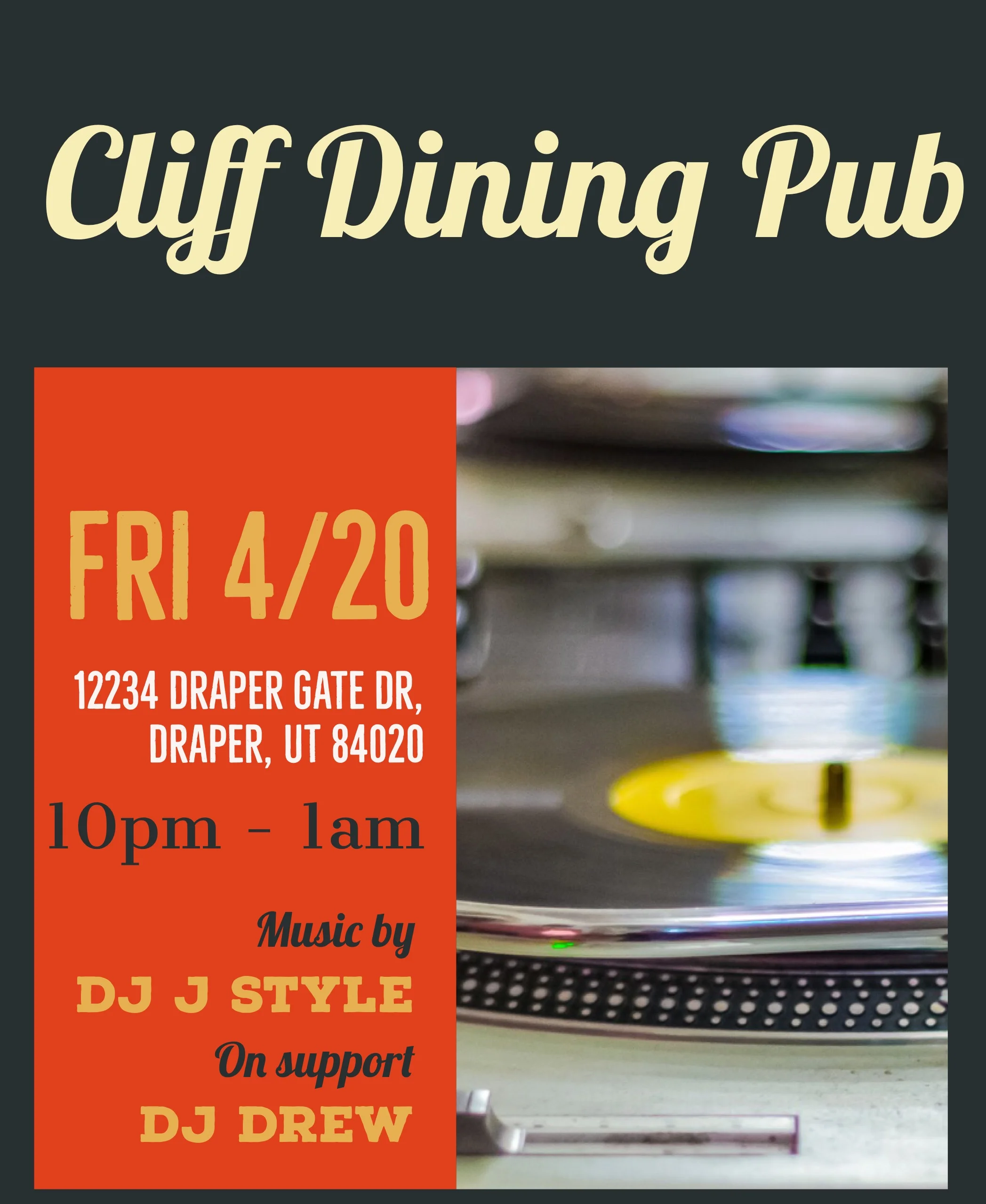 Cliff Dining Pub Friday, April 20, 2018 10:00 PM 22:00 Saturday, April 21, 2018 1:00 AM 01:00 Cliff Dining Pub (map) Google Calendar ICS
