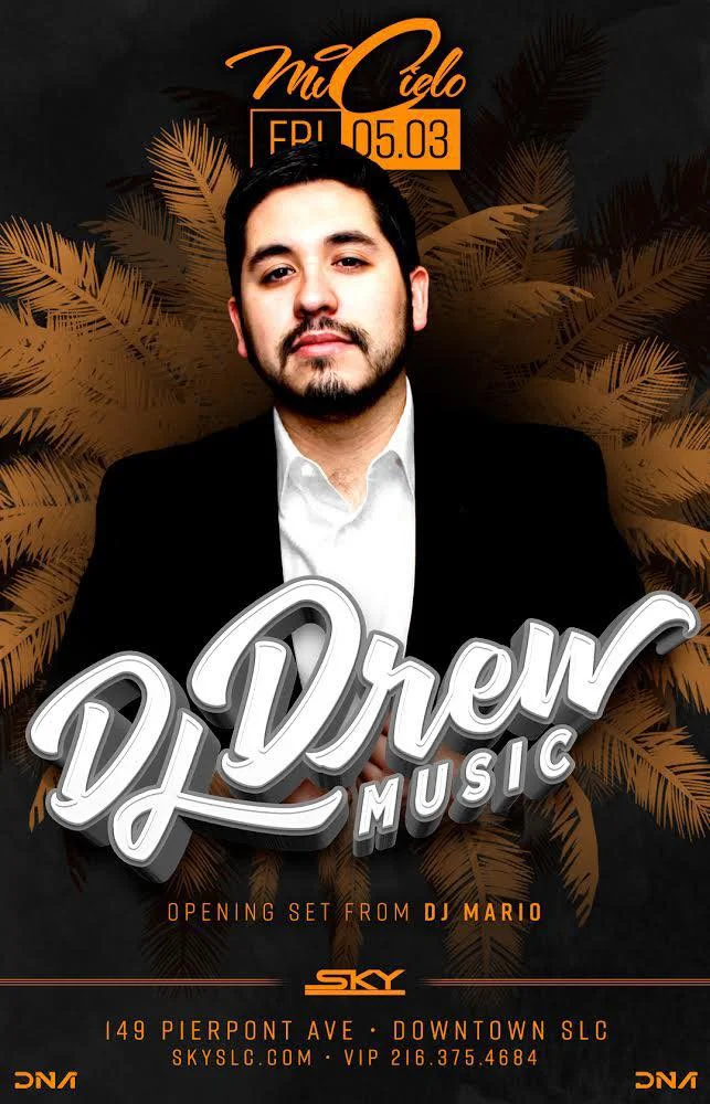 DJ Drew Music is regularly booked for various high profile corporate and private events throughout the Utah area as well as performances at several large clubs and venues where he has opened for Flor De Toloache, Las Cafeteras, La Santa Cecilia, De La Ghetto, Don Omar, Fulanito, 24 Horas, Sensato, El Chevo, Sito Rocks, David Rolas, Nayi, Luis Coronel and more.