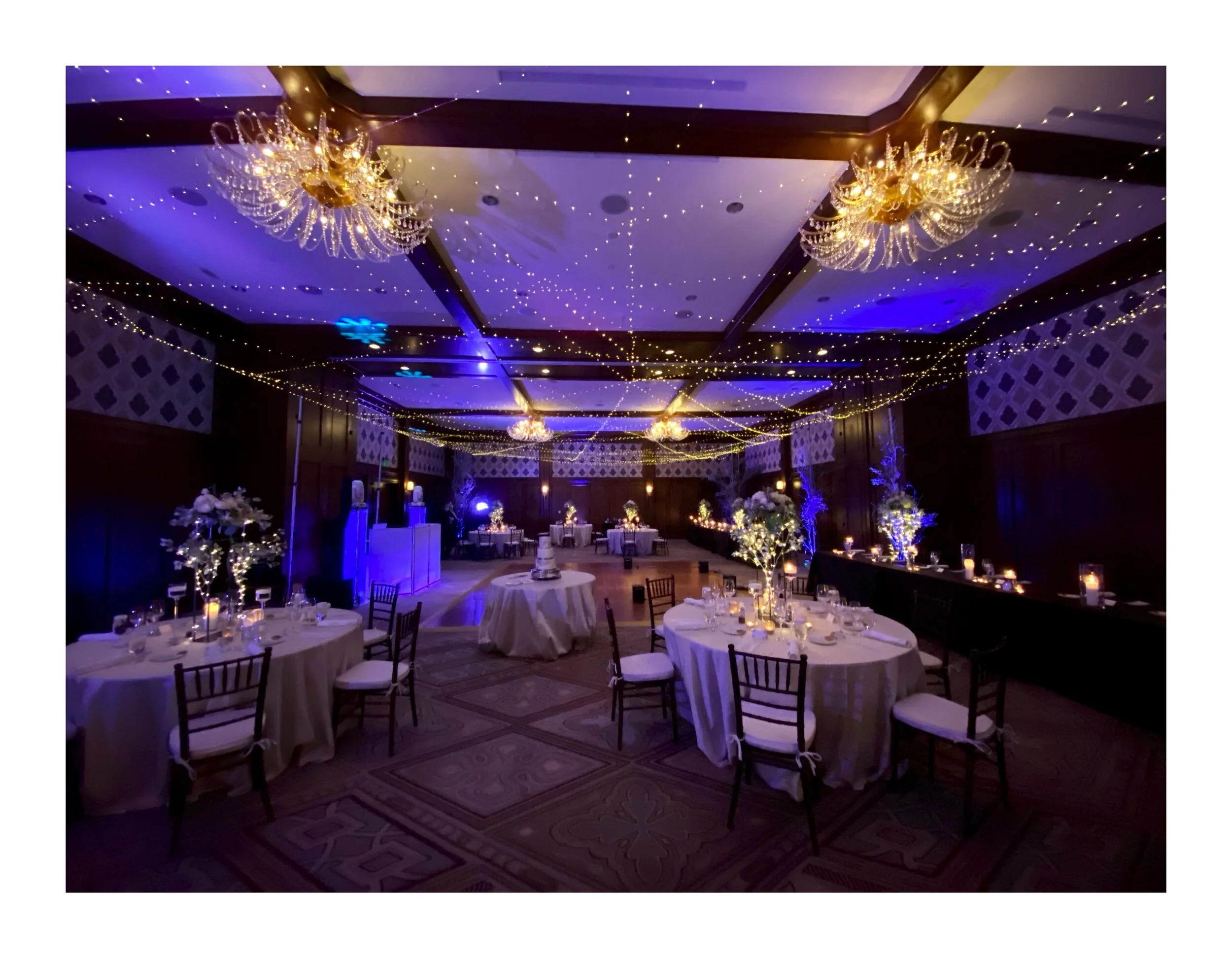 Uplighting is a popular lighting effect created by strategically placing lighting fixtures on the floor and pointing them up. Thus creating the effect of “up lighting”. Uplighting is a very effective way to dramatically improve the ambience of an event space.